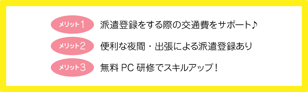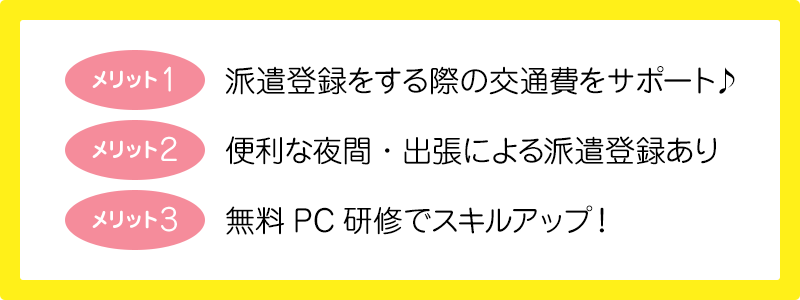 派遣登録の際の交通費サポート、夜間・出張・土日登録あり