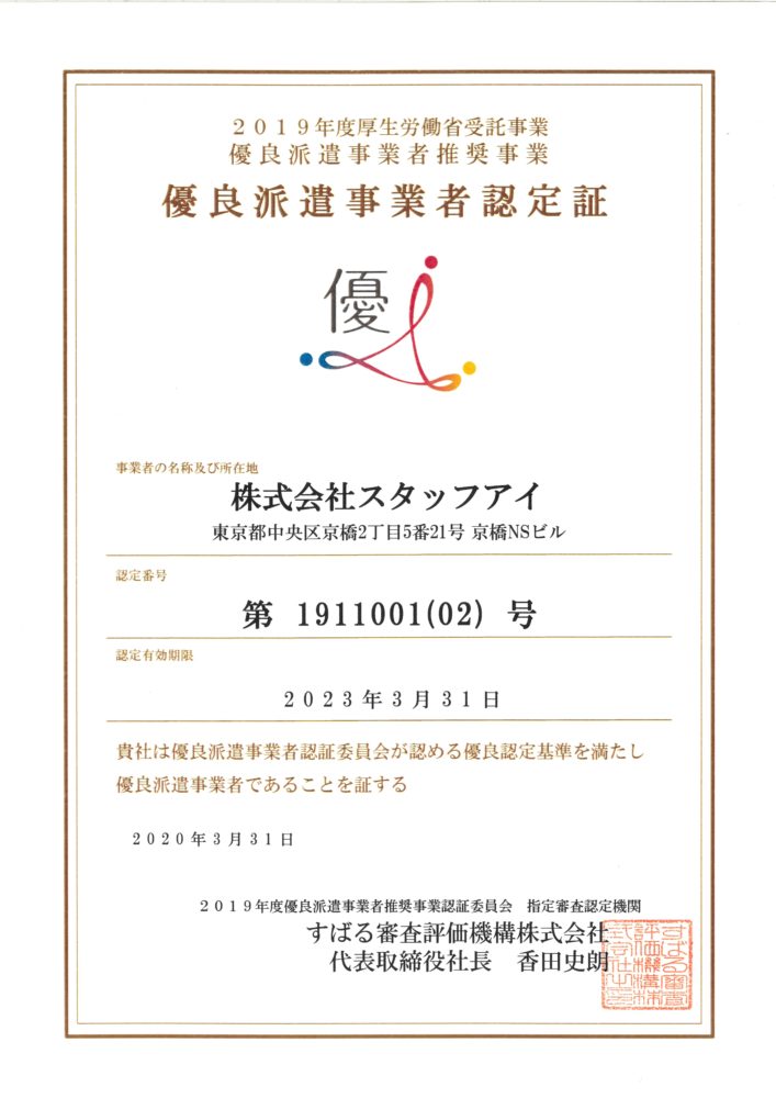 当社は2020年3月31日に、認定機関により『優良派遣事業者』として