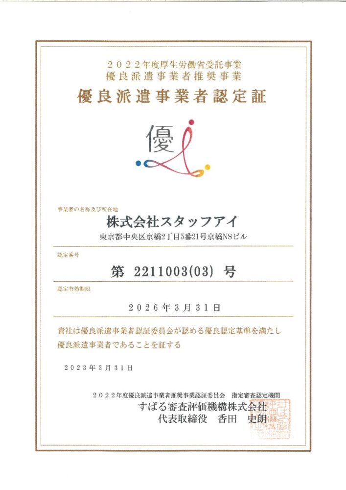 当社は2023年3月31日に、認定機関により『優良派遣事業者』として正式に更新の認定をされましたことをお知らせ致します。