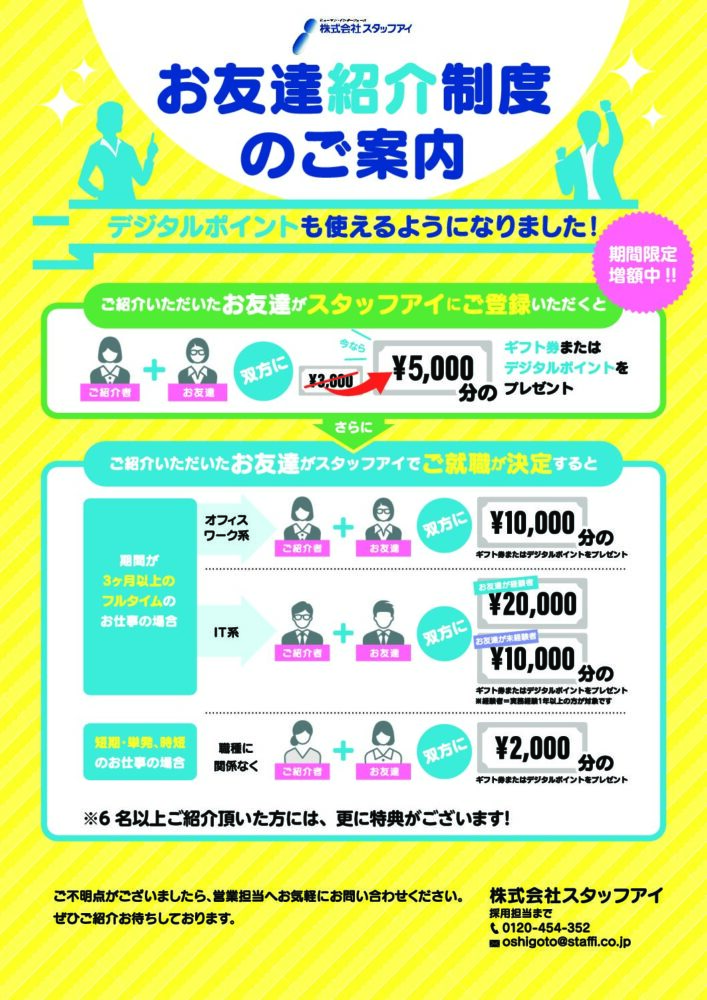 スタッフアイでは、期間限定でお友達紹介料金の金額を増額しております。