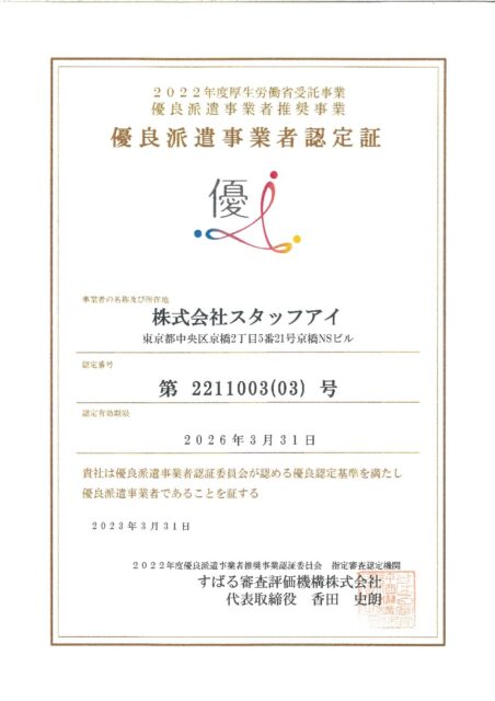 優良派遣事業者認定 更新のお知らせ